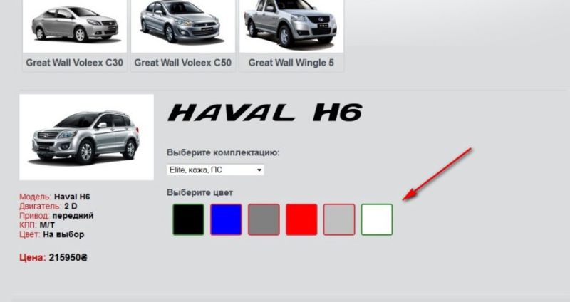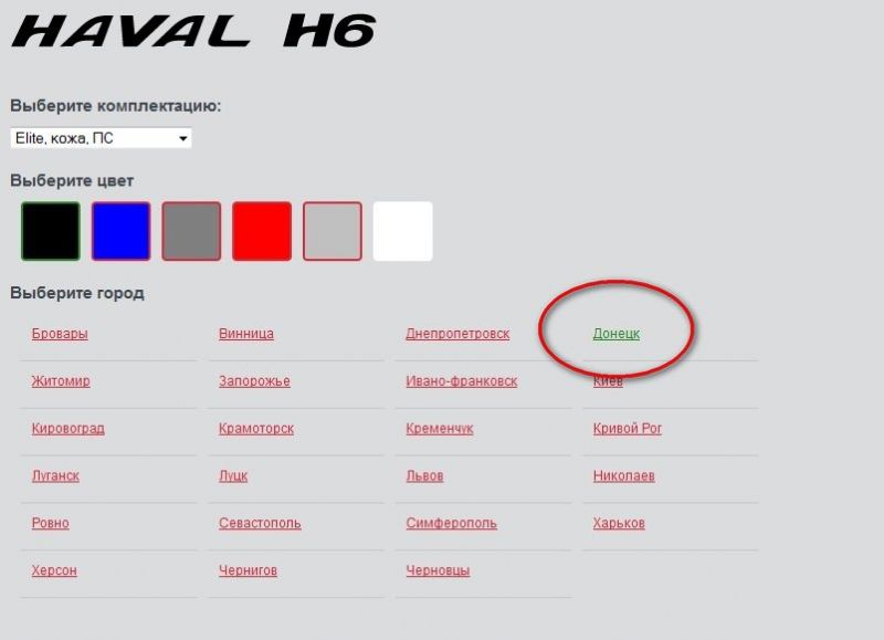 Определившись с цветом, ниже клиент увидит список городов, в которых есть дилерские центры Great Wall. При этом зеленым будет отмечен тот город, в котором в наличии есть автомобиль в той комплектации и цвете, который приглянулся покупателю.