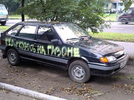 "Вот уже несколько недель мы раскрашиваем машины тех долб...ов, которые паркуются на газонах. Обычно просто пишем что-то вроде "Паркуюсь на газоне", "Паркуюсь на газоне. Гринбомберы" или типа того. Цель – четко донести месседж и наказать автовладельца рублем. Да, это цинично, кто-то может посчитать это хулиганством, но это работает".