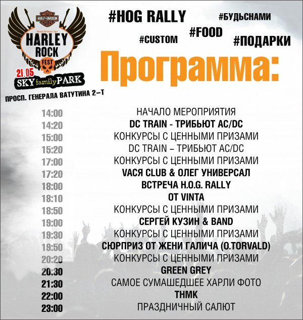 Хиты от любимых артистов: ТНМК, Сергей Кузин band, OT VINTA, Vacя Club & Олег Универсал и Green Grey. Уличная еда на любой вкус, пятиметровая бесплатная пицца, настоящие байкерские напитки, тату и бодиарт, конкурсы, розыгрыши и многое другое.