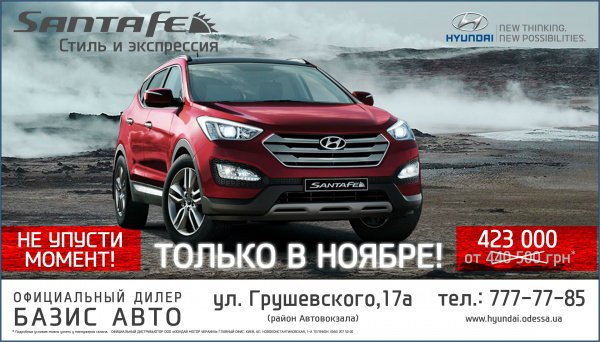 Хотите разгадать код ярких эмоций Hyundai и управлять мечтой? Этой осенью впечатляющий Hyundai Santa Fе находится в фокусе пристального внимания! До конца ноября 2014 года дерзкий и элегантный Santa Fe доступен от 423 000 грн.!