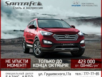 Хотите разгадать код ярких эмоций Hyundai и управлять мечтой? Этой осенью впечатляющий Hyundai SantaFE находится в фокусе пристального внимания! До конца октября 2014 года дерзкий и элегантный SantaFe доступен от 423 000 грн.!