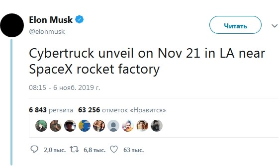 Накануне в своем twitter-аккаунте глава Tesla Илон Маск наконец-то назвал дату презентации электрического пикапа: «зеленую» новинку, так активно обсуждаемую в профильных СМИ и соцсетях, покажут 21 ноября в Лос-Анджелесе. Мероприятие организуют неподалеку от предприятия компании SpaceX, где производят ракеты. В каком образе представят электропикап, в концептуальном или серийном, пока не известно.