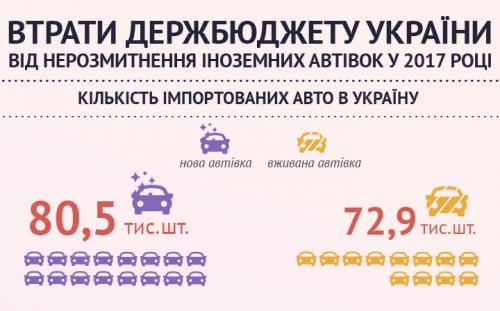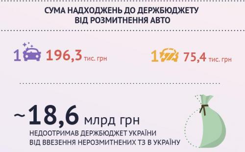 Средняя сумма поступлений в госбюджет от растаможки одной новой иномарки составляет 196,3 тыс. грн, а от подержанной – 75,4 тыс. грн. По официальным данным ГФС, в январе 2018 года в Украине насчитывалось более 246,4 тыс. автомобилей с иностранной регистрацией с нарушением срока пребывания.
