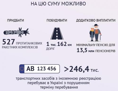 Если количество так называемых «евроблях» с нарушением срока пребывания (246,4 тыс.) умножить на среднюю сумму поступлений от одной подержанной машины (75,446 грн), то получается кругленькая сумма в 18,5 млрд грн. Именно столько не дополучил госбюджет Украины от ввоза нерастаможенных иномарок в 2017 году.