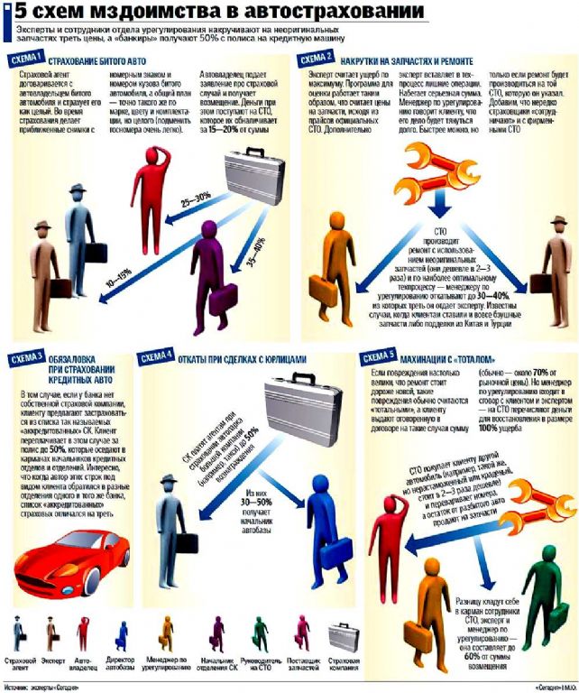 Вполне возможно, что так оно и есть. Но, как удалось выяснить «Сегодня» в ходе журналистского расследования, дело не только в недобросовестных клиентах. Главными мошенниками являются сами сотрудники страховых компаний, причем как действующие, так и бывшие (для «работы» у них налажены связи с действующими). Как рассказал «Сегодня» один из страховщиков на условиях анонимности, этот бизнес давно погряз в откатах, причем замешаны в этом почти все — от страховых агентов и мастеров СТО до топ-менеджмента крупных компаний.