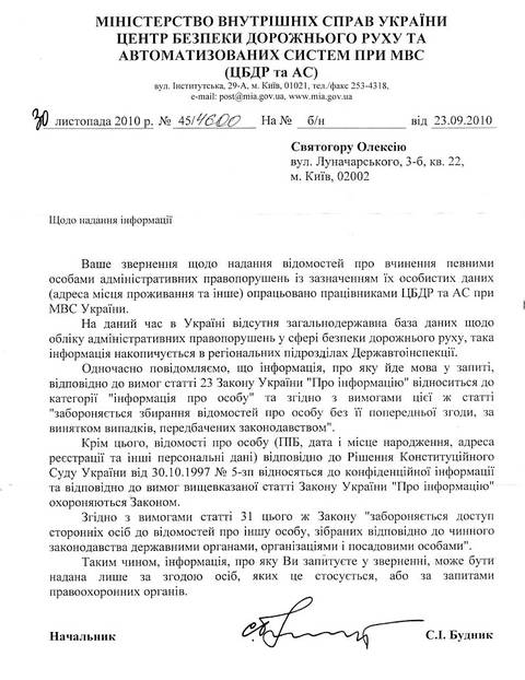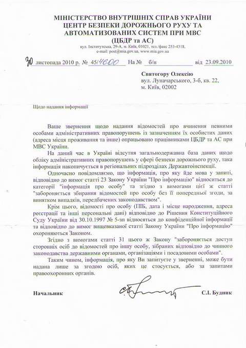 (Благо, откровенно говоря: у меня была предварительная договоренность с моими знакомыми в случае подачи запрашиваемой информации в мой адрес руководством ГАИ – против последних будут немедленно поданы исковые заявления в суд о взыскании морального вреда, причиненного распространением конфиденциальной информации в мой адрес, а также заявление о совершении преступления, предусмотренного ст. 182 Уголовного Кодекса Украины (нарушение неприкосновенности частной жизни через распространение конфиденциальной информации о лице).