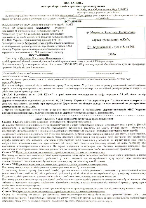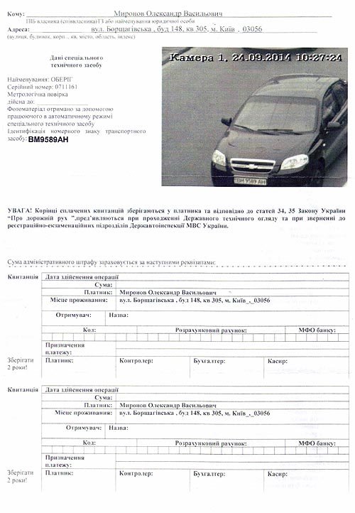 Система «Амулет» - это когда те же камеры расположены в автомобиле инспекторов ГАИ. По сути – это мобильная версия «Оберіга». Камеры могут «смотреть» в разные стороны и фиксировать нарушения сразу в двух направлениях. Поэтому, не стоит думать, что если машина ГАИ стоит на противоположной стороне дороги, вам ничего не угрожает и можно нарушать. «Письма счастья» от «Амулета» и «Оберіга» летят в обе стороны. К слову, в системе предусмотрена автоматическая распечатка самих писем с уведомлениями о нарушении. Вот, как они выглядят.