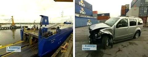 Этот паром прибыл из Америки - на его палубе и грузовых отсеках помещается 120 огромных грузовых контейнеров. В Литву транспортные компании доставляют продукты, запчасти и, конечно же, автомобили. У грузчиков здесь всегда хватает работы. Самое нелюбимое дело - вытаскивать из контейнеров покорёженные иномарки. Нисан 2005 года пришёл в порт (к городу Клайпеда) рано утром из Америки. С помощью разных приспособлений его извлекли наружу.