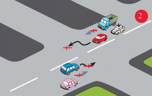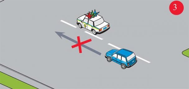 Обгонять или опережать ТС с включенными проблесковыми маячками синего и красного цвета или только красного, а также зеленого или синего и зеленого цвета запрещается (3). Нельзя также двигаться по смежным полосам со скоростью колонны или занимать место в колонне.