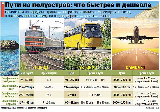 В аэропорту шанс выбраться из автономии куда выше, вот только все направления, кроме столичного, за последние полгода закрылись. «Да и в Киев взять билет за пару дней до вылета можно только на дорогих авиалиниях. В лоукостах, где можно сэкономить 300—500 грн, уже за месяц все забронировано, — рассказали в агенстве по продаже билетов. — Кстати, недавно пять рейсов в неделю в Борисполь открыла симферопольская авиакомпания, которая берет за перелет около 400 грн».
