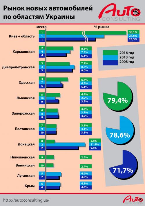Рейтинг Топ-10 регионов в 2008 году начинался с Киевского региона (23,5%), а на втором месте шла Донецкая область (9,8%), третьей была Днепропетровская (8,0%), а четвертая – Харьковская (6,1%), на пятом месте – Одесская (5,1%), далее шел Крым, Луганская, Запорожская, а вот Львовская была на 9-м месте с показателем 3,9%. А замыкала Топ-10 Полтавская область, где продавалось 3,1% всех новых автомобилей в Украине.