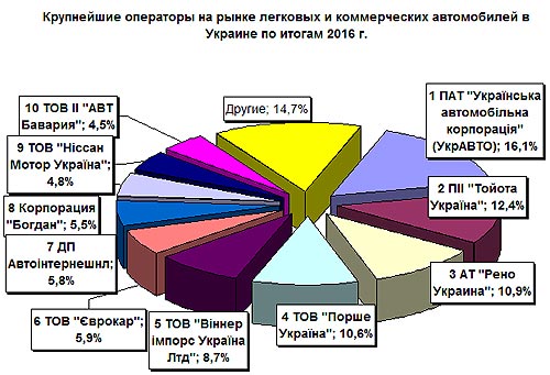 Последние годы дались многим очень не просто. Но лидер – неизменный. По итогам 2016 года, по данным AUTO-Consulting, самым крупным оператором является корпорация «УкрАвто» с показателем 16,1% украинского рынка. Уже два года подряд на втором месте – «Тойота Украина», которая за 2016 год прибавила во влиянии и теперь занимает 12,4% рынка. На третьем месте по итогам прошлого года - «Рено Украина» с показателем 10,9%.