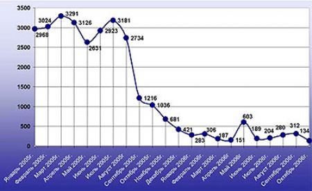 Большинство экспертов считают, что автомобильный рынок и рынок недвижимости - это непересекаемые рынки, которые никак не влияют один на другой. Однако, в 2006 году рузкий спад сделок все же сказался на росте продаж автомобилей. Мы решили вернуться к рынку недвижимости и проследить те тенденции, которые характерны для рынка этой осенью. Как можно видеть на графике, рынок недвижимости еще не отошел от кризиса, спровоцированного "Элита-Центр", хотя уже вышел на показатели начала 2006 года.