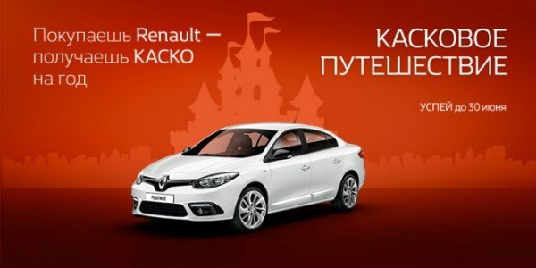 Кредит от Renault Finance также становится доступнее с предложением “КАСКОВА ПОДОРОЖ”. В случае кредита доплата за премиум КАСКО для клиента составит всего 2,5% от стоимости автомобиля, что в 2-3 раза меньше стандартного тарифа при оформлении кредита. Вместе с тем, действуют выгодные кредитные условия для моделей, участвующих в акции: Fluence, Sandero, Sandero Stepway, Logan MCV 0% на 2 года!