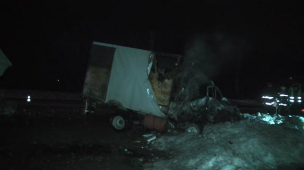 Отмечается, что в 4:17 пожар был ликвидирован, спасатели изъяли из грузовика обгоревшие тела погибших мужчин.