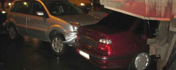 Вчера, в 17:20, в городе Харьков по ул. Вернадского водитель автомобиля ''КрАЗ'' по неизвестным пока причинам внезапно начал движение задним ходом и совершил столкновение с шестью транспортными средствами.