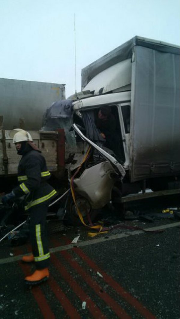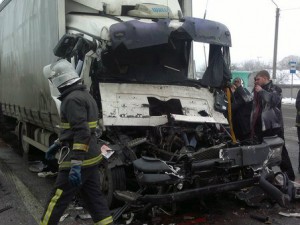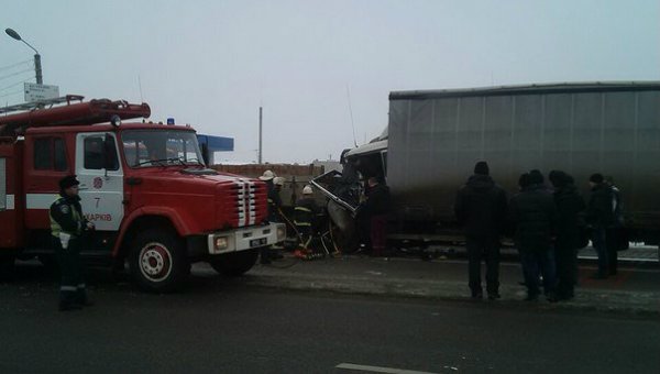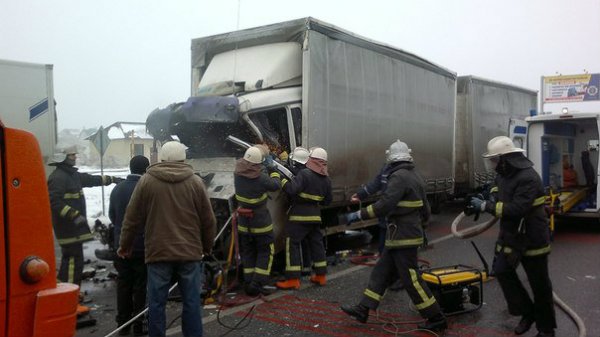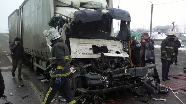 Сегодня, около 10 утра, под Харьковом, в поселке Песочин, столкнулись грузовики "MAN" и "Mercedes", которые ехали в попутном направлении.