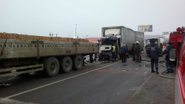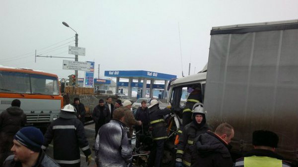 В облуправлении ГАИ сообщили, что в ДТП пострадал один человек. По словам очевидцев, это водитель одного из грузовиков – у него сильно повреждена нога.