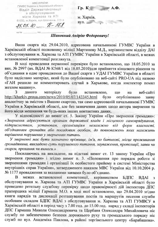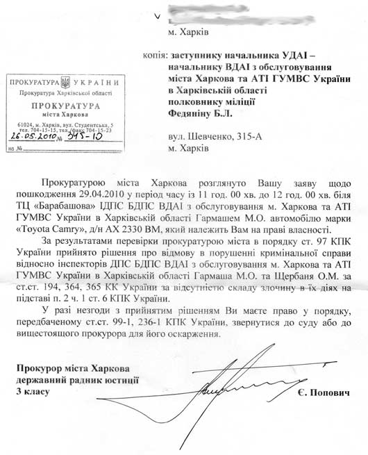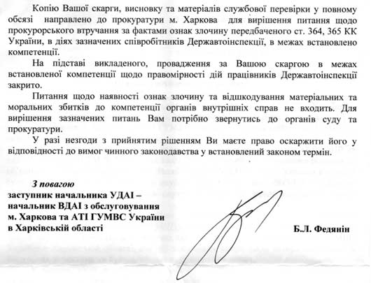 Ответ прокуратуры означает, что в Украине любой работник ГАИ может ударить жезлом по вашему автомобилю и за это ему ничего не будет. Видимо в прокуратуре считают, что водители просто наговаривают на честных работников ГАИ, которые всю свою жизнь посвятили служению горячо любимому украинскому народу, а люди еще и недовольны оказанной им честью.