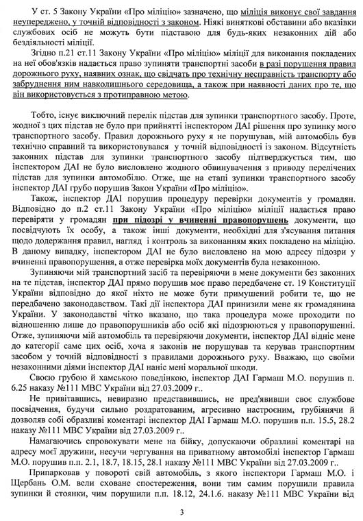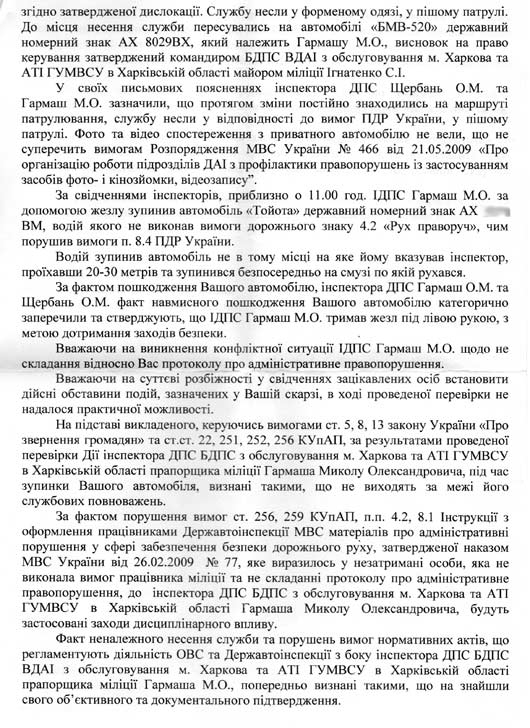 Это означает, что как только инспектор ГАИ вышел на службу – ему запрещено использовать частный автомобиль, даже для передвижения по городу. Формулировка ГАИ, что ГАИшник якобы нес пешее патрулирование, никак не оправдывает того факта, что инспектор нарушил инструкцию. Поскольку Гармаш во время работы ездил на частном автомобиле, садился в него – он прямо нарушил запрет МВД.