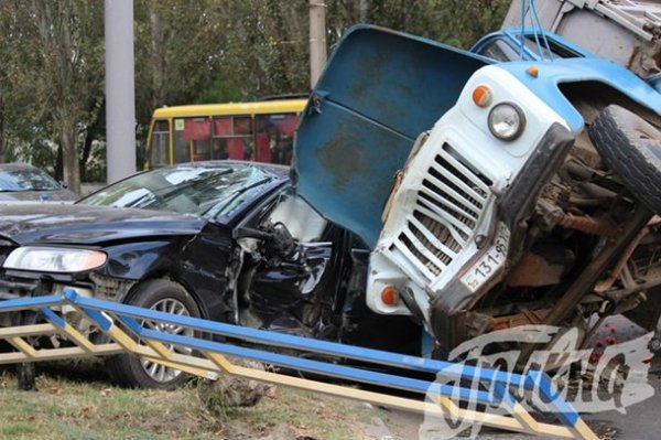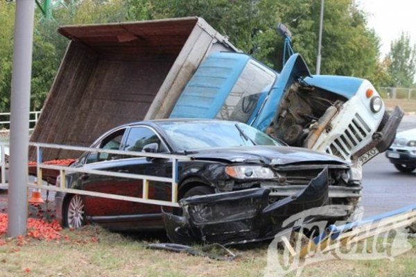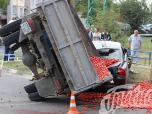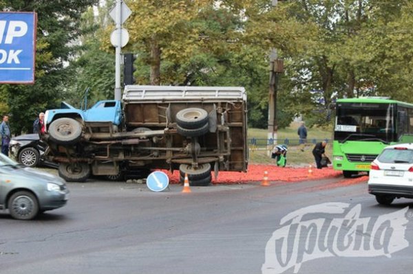 В Херсоне в среду, 30 сентября, столкнулись груженный помидорами автомобиль ГАЗ и Volvo S80. В результате аварии перевернулся грузовик с помидорами и овощи рассыпались по всей улице, сообщает .