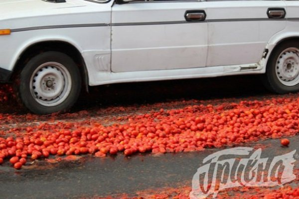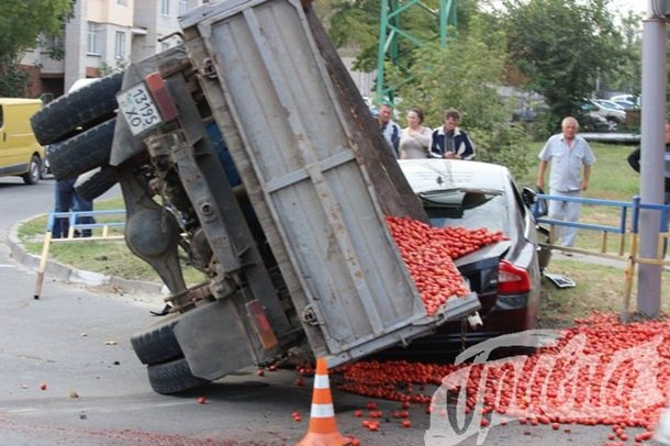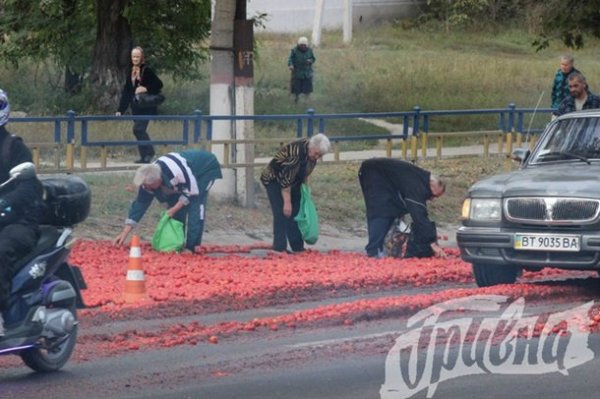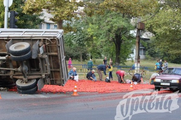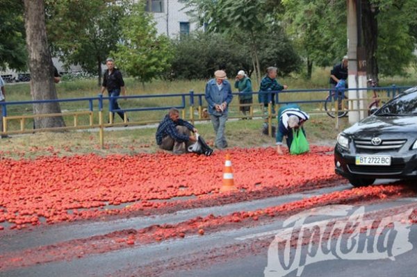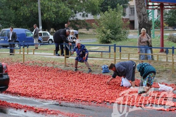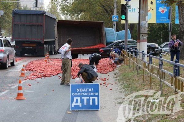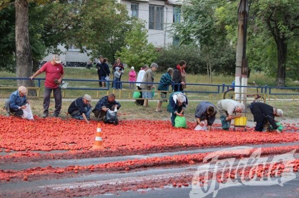 Кроме того, в результате аварии грузовик перевернулся и рассыпал помидоры, которые прохожие собирали в пакеты, ведра, а некоторые даже пошли за тележками.
