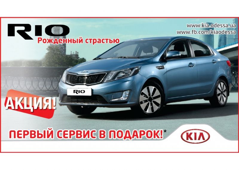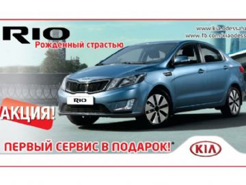 * Предложение действует с 10.07.2013 по 31.08.2013 г. только в ООО “АВТОЦЕНТР КИА”. Под подарком подразумевается, получение клиентом, который приобрел автомобиль KИА РИО в период проведения Акции, Подарочного сертификата на прохождение ТО-0 за 1,20 грн. Действие сертификата распространяется исключительно на проведение ТО-0 в ООО «АВТОЦЕНТР КИА». Подробности у менеджеров автосалона.