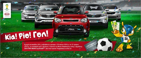 В период с 18 апреля по 31 мая 2014 года все, кто приобретет автомобили КИА, сможет принять участие в розыгрыше двух билетов на громкое футбольное событие года: финал Чемпионата мира FIFA 2014, который состоится 13 июля 2014 года в колоритном Рио де Жанейро, Бразилия.