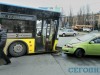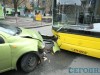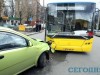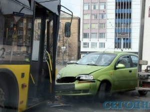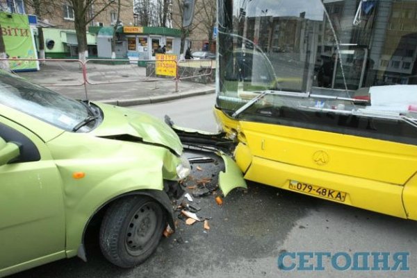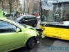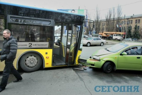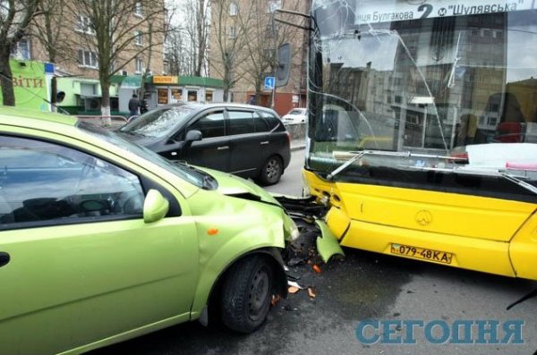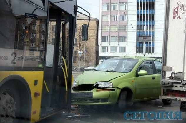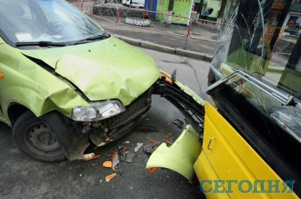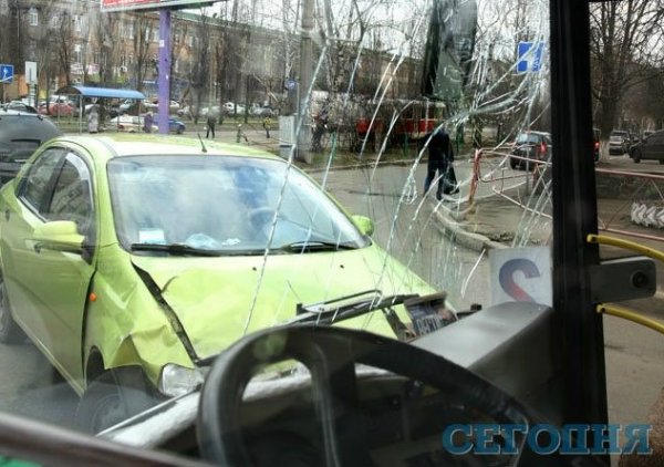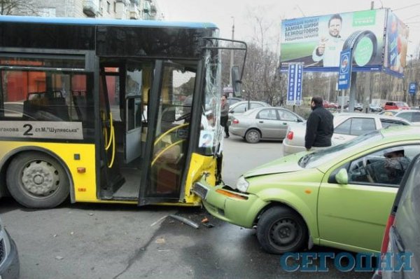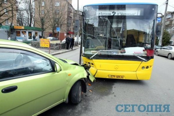 В четверг в 6.50 утра в Киеве на перекрестке улицы Героев Севастополя и бульвара Лепсе произошла авария. Салатовый Chevrolet Aveo лоб в лоб врезался в автобус №2, стоящий на светофоре.