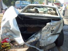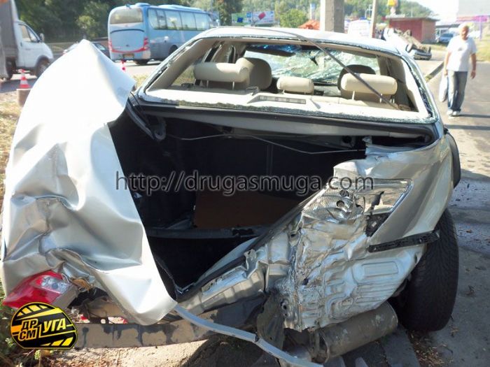 После столкновения автомобиль Toyota Camry ушел вправо, врезался в столб, срубив его, немного отскочив от него и развернувшись на 90 градусов, после чего по касательной ( задней частью) столкнулся с деревом.