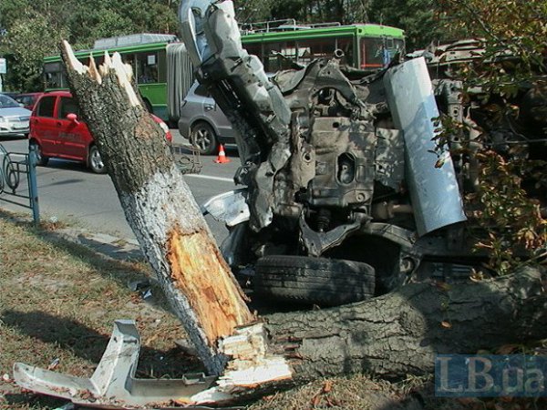 Киев: джип после лобового столкновения влетел в дерево и пробил металлический забор. (Фото)