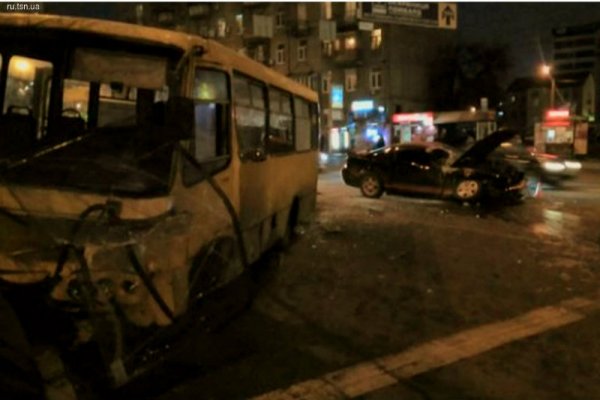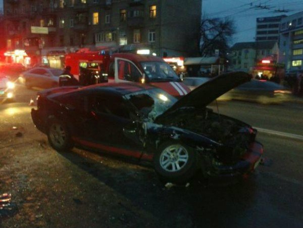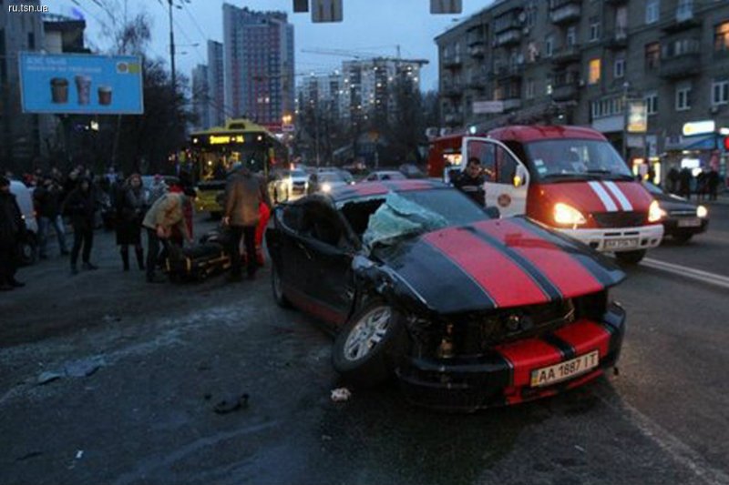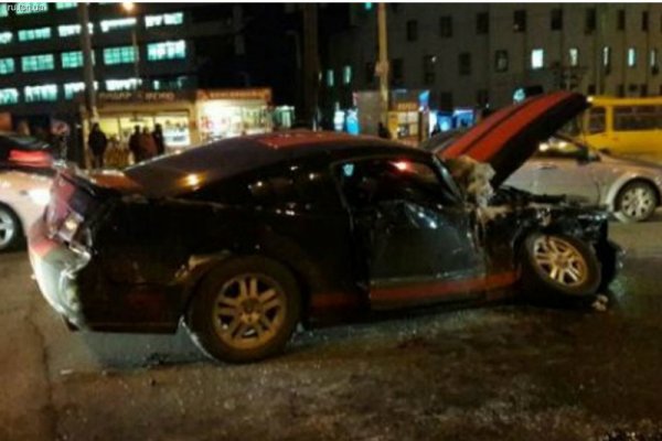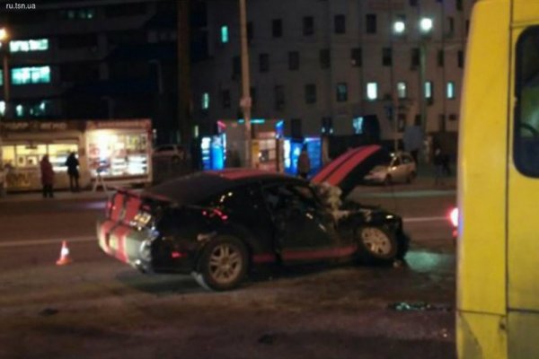 В Киеве Ford Mustang вылетел на полосу встречного движения и врезался лоб в лоб в маршрутку с пассажирами, припечатав ее в металлическое ограждение на тротуаре, сообщает .