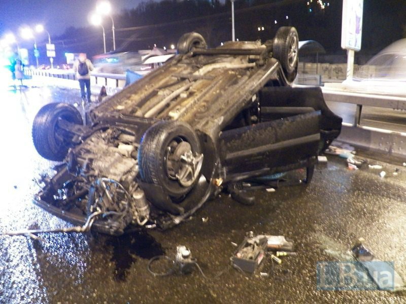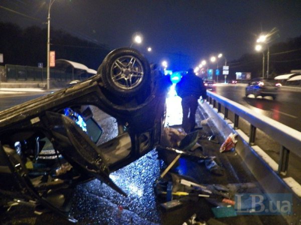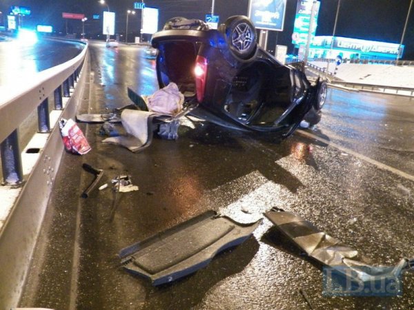 В субботу вечером, в Киеве на бульваре Дружбы Народов автомобиль Ford Fiesta, двигаясь в направлении моста имени Патона, протаранил ленту отбойника, после чего перевернулся на крышу, сообщает .