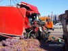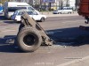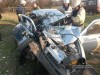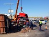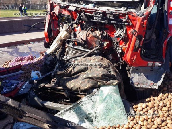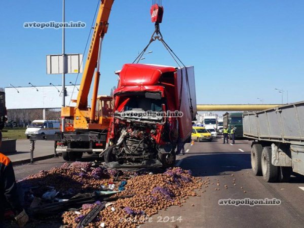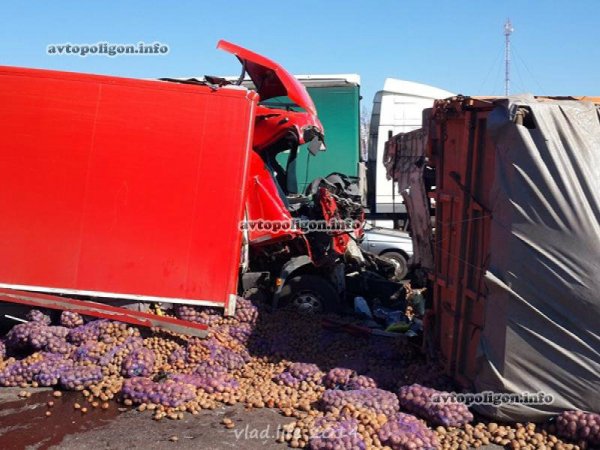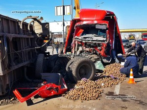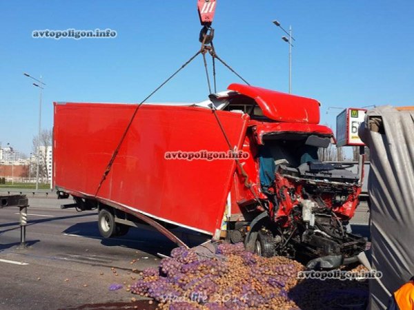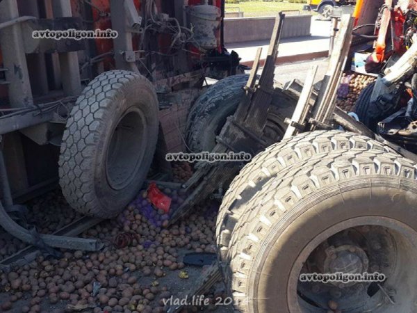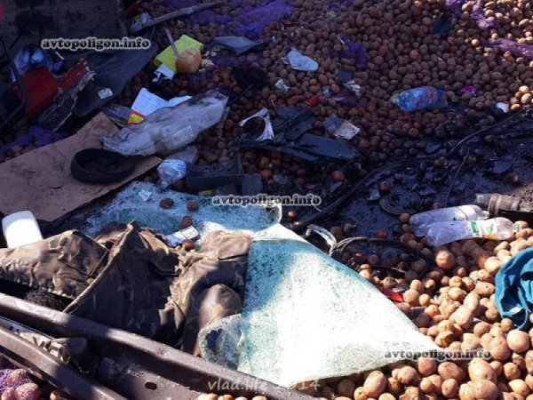 От сильнейшего удара прицеп опрокинулся, оторвавшись от грузовика, вылетели оба моста. У DAF полностью смяло кабину. Из кузова на дорогу выспыался груз - мешки с картошкой.