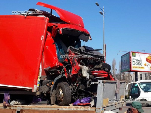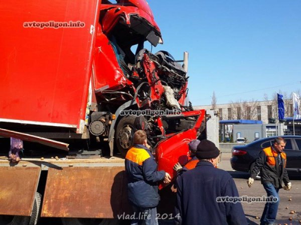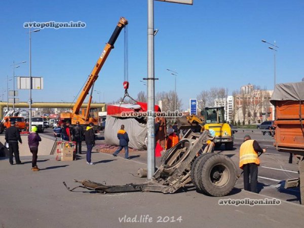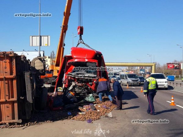 Данное ДТП произошло в Киеве 30.03.2014, около 07:15, на проспекте Бажана 196, в 50 метрах от Харьковской площади. Водитель грузовика DAF, двигаясь по Бажана в направлении Бориспольской трассы, на высокой скорости врезался в притормозивший перед светофором попутный КАМАЗ с прицепом, перевозивший кукурузу, сообщает .
