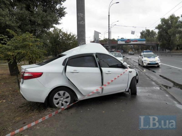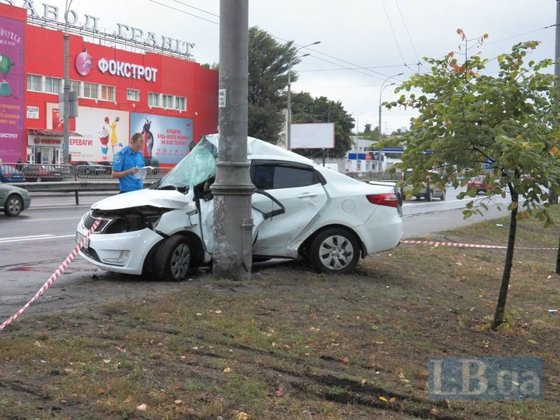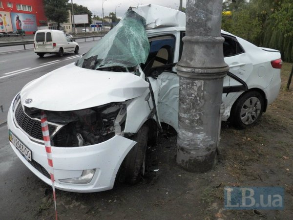 В воскресенье, 6 сентября в Киеве на проспекте Освободителей, возле парка "Победа", автомобиль KIA на повороте дороги вылетел за пределы проезжей части и левым боком врезался в осветительную опору, сообщает .