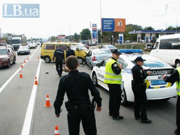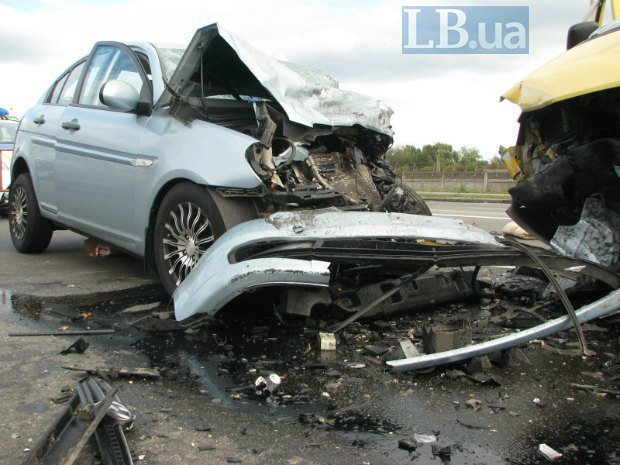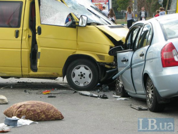 В воскресение днем в Киеве на Броварском проспекте возле станции метро "Лесная" произошло лобовое столкновение микроавтобуса Volkswagen Transporter и автомобиля Hyundai, сообщает .