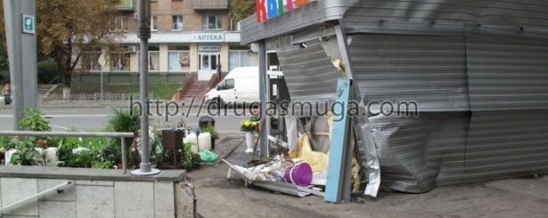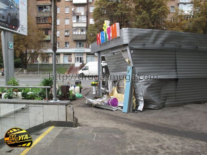 В субботу, 18 сентября, в 0:15 водитель Mitsubishi Lancer, 29-летний киевлянин, двигаясь в направлении Кловского спуска на перекрестке с улицей Л. Первомайского не справился с управлением и на повороте совершил наезд на электроопору, зацепил рекламный щит, а затем врезался в цветочный киоск, сообщает .