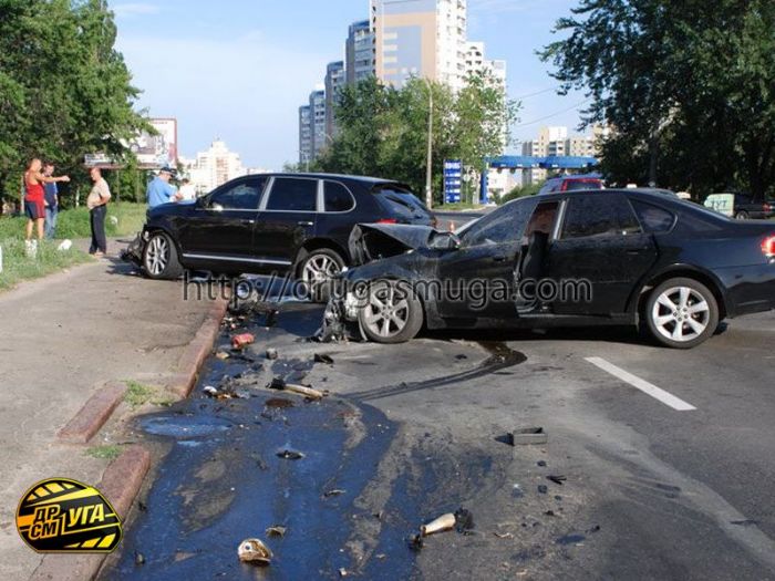Молодой водитель (1992 г.р.) на Porsche Cayenne Turbo решил выехать с прилегающей дороги на главную - на Харьковское шоссе и повернуть через двойную сплошную линию разметки - налево в сторону Ленинградской площади, срезая полосу встречного движения. В это время в крайнем левом ряду от перекрестка с Привокзальной (или от Ленинградской площади) двигался автомобиль Subaru Legacy под управлением женщины (1962 г.р.). Водитель на Subaru пыталась уйти от аварии и инстинктивно приняла влево на встречную полосу, где и произошло столкновение. В результате удара японский седан задымился, но возгорания удалось избежать после оперативного применения огнетушителя.