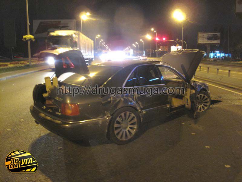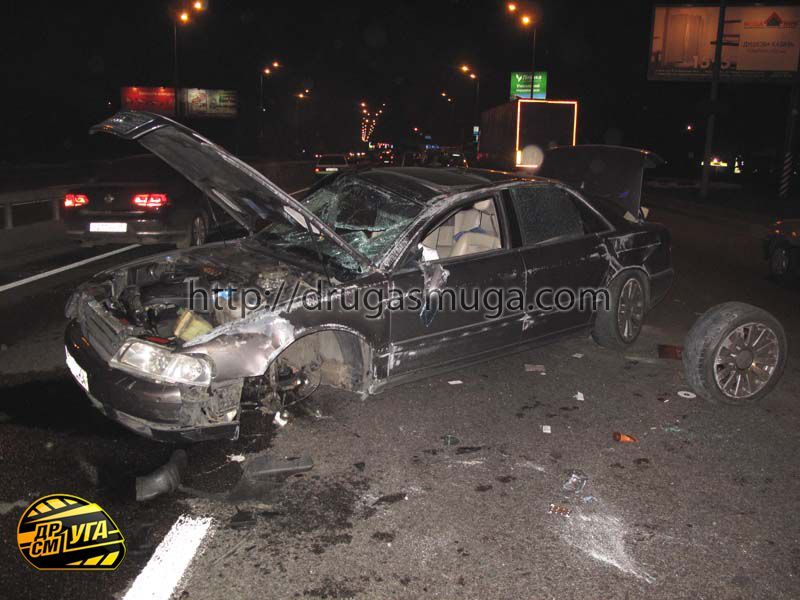 Предварительно установлено, что автомобиль Audi A8 двигался от проспекта Н. Бажана в направлении г. Борисполь. По словам водителя Ауди (1986 г.р., 7 лет водительского стажа), его ослепил встречный автомобиль, после чего люксовый седан выехал на ограждающий барьер (который сработал как трамплин) и перевернулся несколько раз.