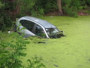 Полноприводный кроссовер резко ускорился врезался в дерево, затем слетел в озеро.