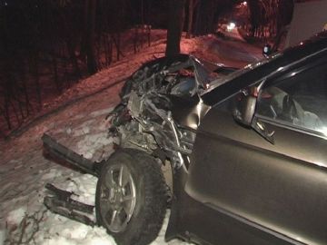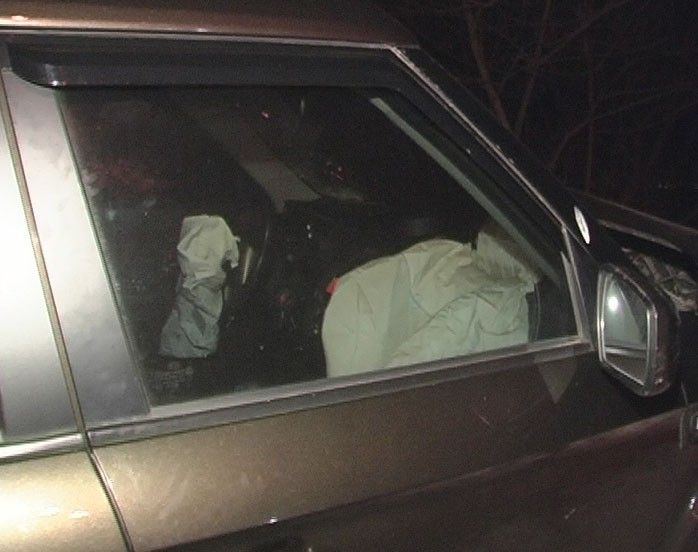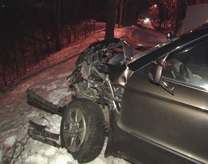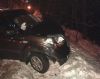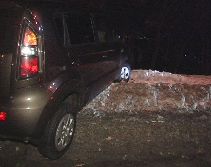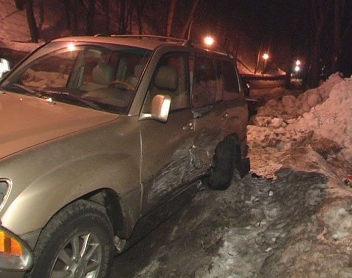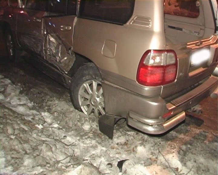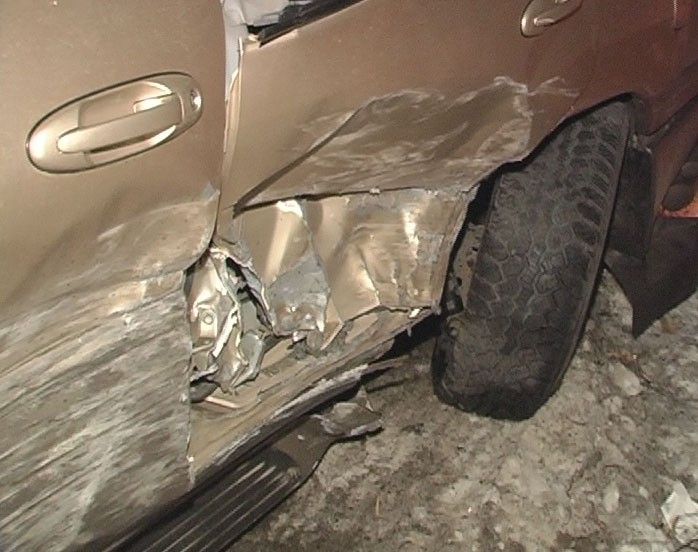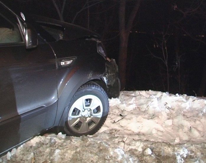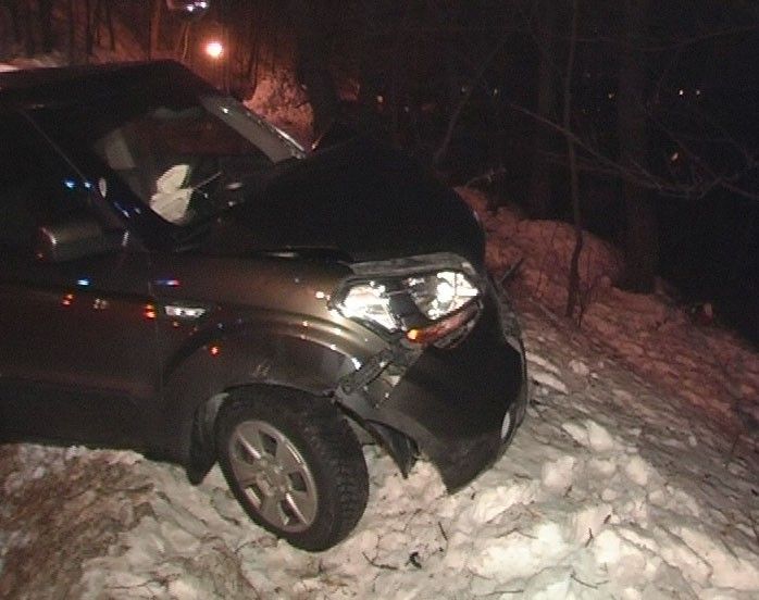 От удара в бок люксовый внедорожник отбросило с дороги, а KIA Soul продолжил путь и остановился в сугробе на обочине, едва не скатившись с обрыва.