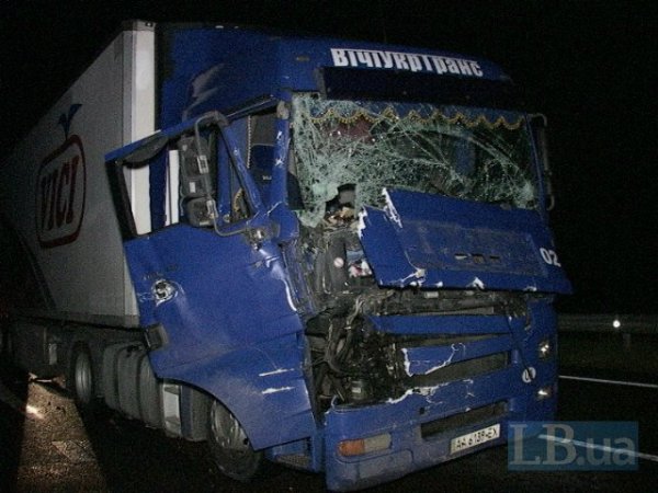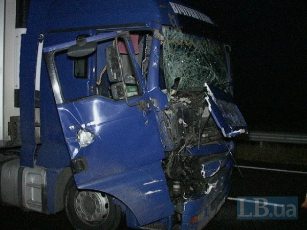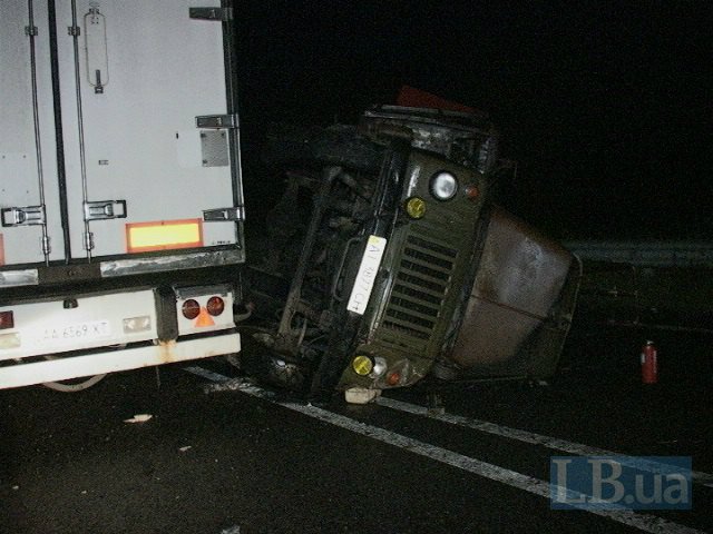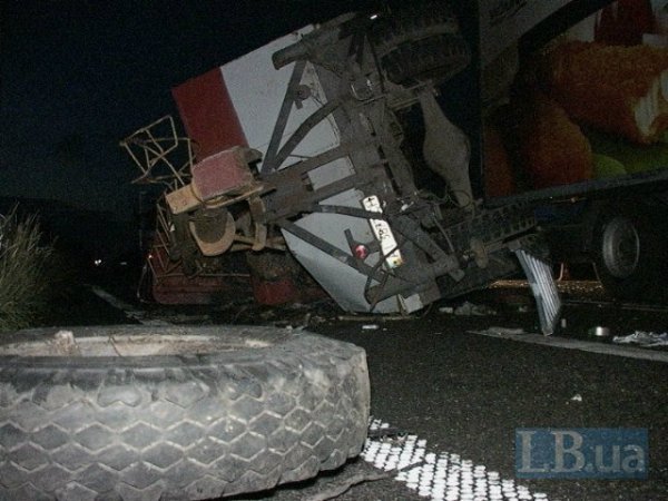 В субботу около полуночи на автодороге "Киев-Харьков" грузовик с полуприцепом MAN, двигаясь в направлении Киева, протаранил двигавшийся перед ним грузовик-автовышку ГАЗ-53 аварийной бригады ремонта электросетей, сообщает .