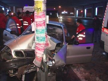По предварительным данным водитель на скользкой дороге потерял управление автомобилем. Внезапно машина сьехала с проезжей части, вылетела на тротуар и протаранила бетонный столб.
