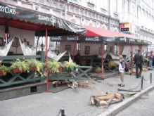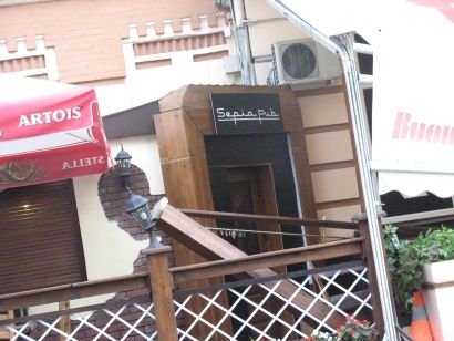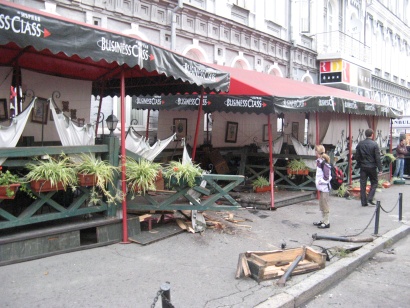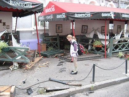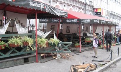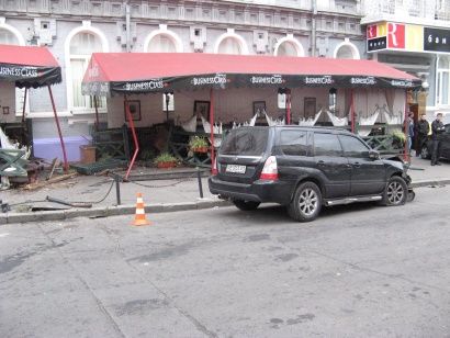 Авто сбило забор с вазонами, шатер заведения, после чего машину отбросило в противоположную сторону дороги — в летнюю площадку ресторана «Цимес». Там авто разбило металлическую и деревянную ограду, разворотило несколько столов, стульев и остановилось, упершись в стену.