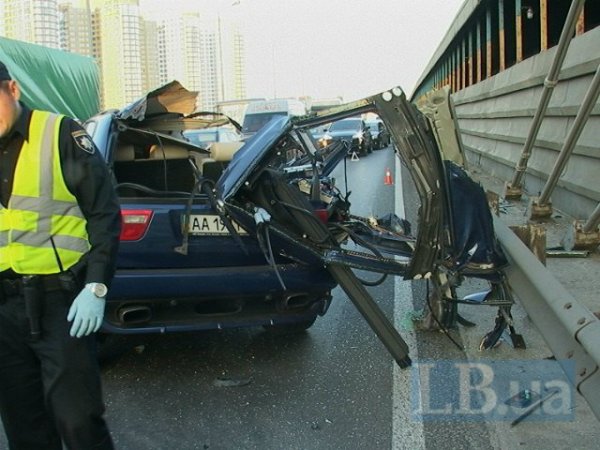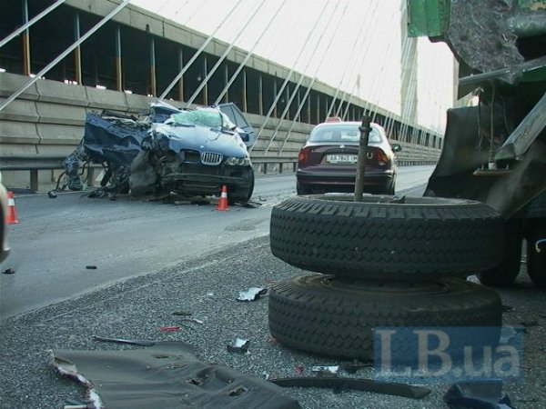 В понедельник вечером в Киеве на Южном путепроводе BMW X5, двигаясь в направлении правого берега на большой скорости, врезался в стоявший в правой полосе грузовик КрАЗ одной из частей Нацгвардии Украины, сообщает .