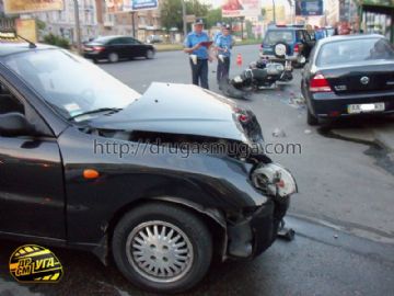 Кто из них двигался на красный - неизвестно. Daewoo Lanos ударил мотоцикл Honda X4 LD в заднее колесо и глушитель, отбросив его на припаркованный (в не в то время и не в том месте) Nissan Almera. Байк врезался в Нисан, повредив ему крыло, порог и колпак.