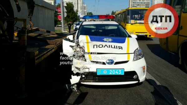 Утром, 8 июля на проспекте Победы возле метро Святошин полицейская Toyota Prius врезалась в маршрутку, которая ехала в попутном направлении, сообщает .