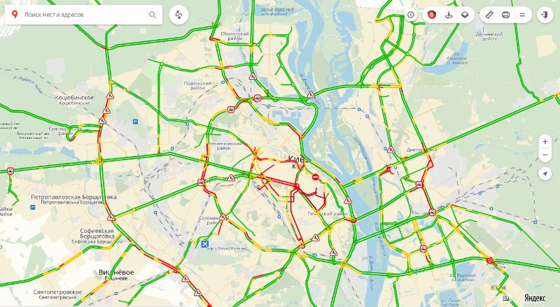 В пробках стоит проспект Соборности, улица Регенаторная, а также затруднено движение на улице Ивана Миколайчука на подъезде к Днепровской набережной.
