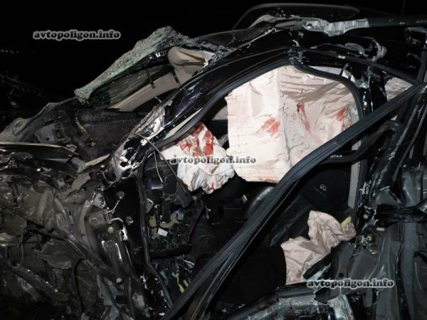 Скорее всего, женщина не пристегнулась ремнем безопасности, во всяком случае такой вывод можно сделать по натянутому, как струна, ремню безопасности (на фото).